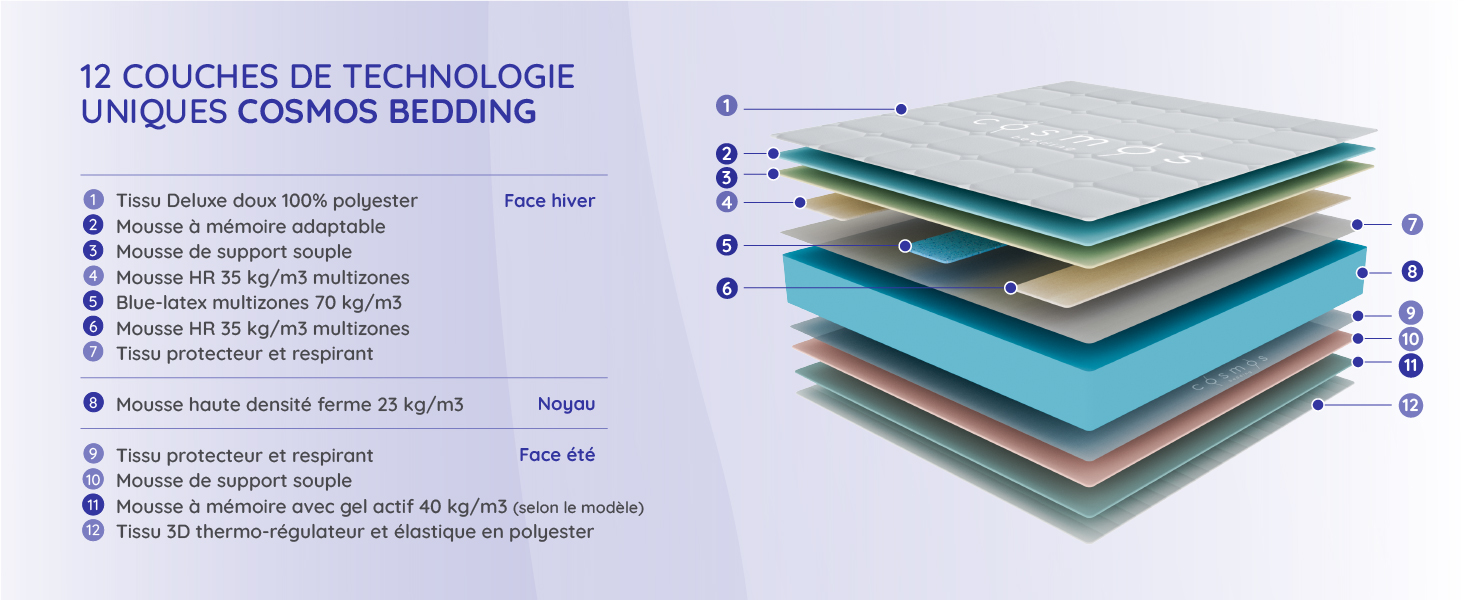 Pourquoi un matelas Cosmos ? Nous sommes présents dans plus de 10 pays pour satisfaire tous nos clients et notre innovation dans les nouvelles technologies du sommeil nous distingue des autres. Notre engagement envers vous, est de vous fournir le repos dont vous avez besoin, en vous satisfaisant pour une bonne nuit de sommeil.